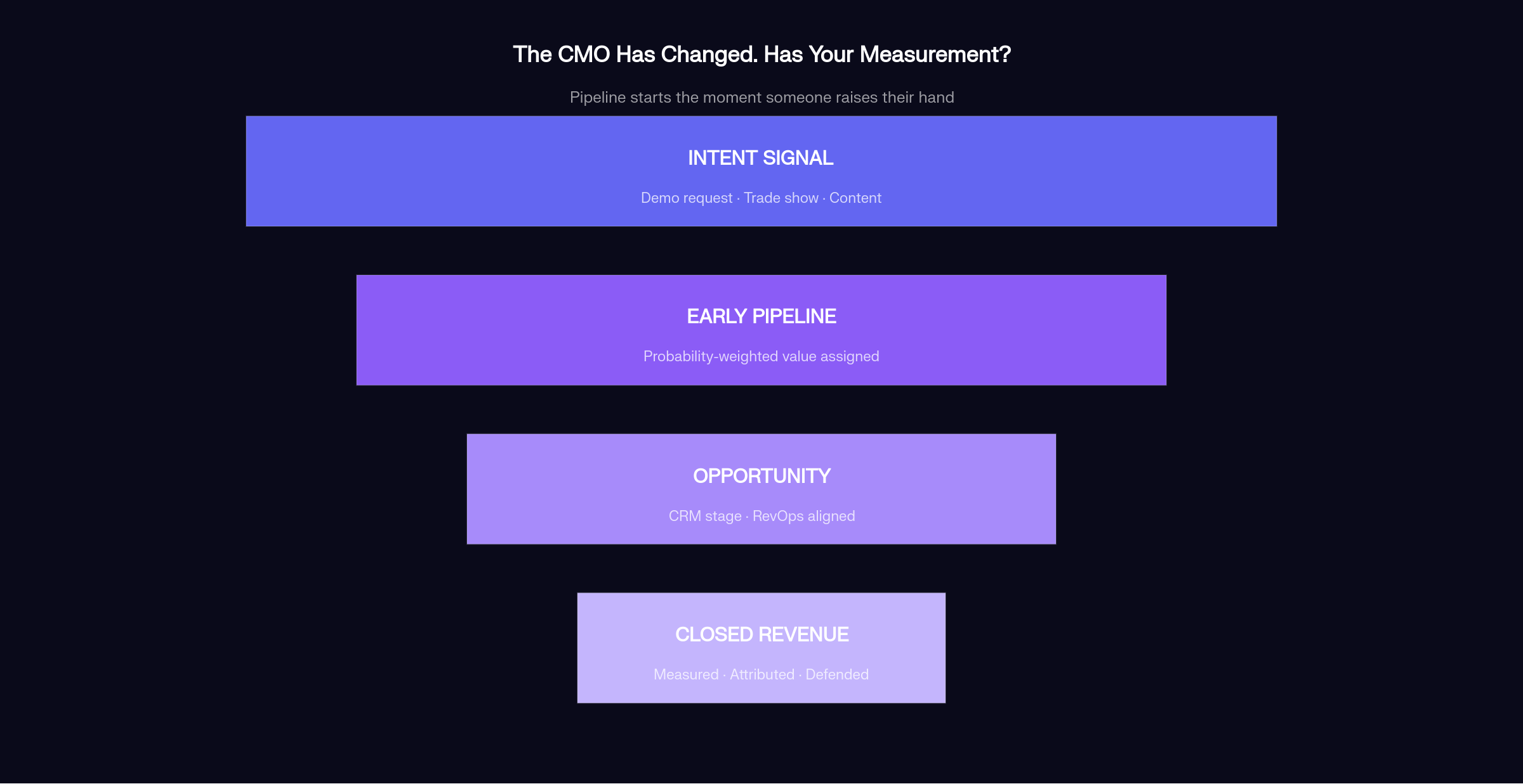 A demo request, a serious conversation at a trade show, a high-intent content download, a referral coming in warm. Those are all signals that real value is forming. If you wait until the CRM opportunity exists to assign any value, you are flying blind on the early funnel and consistently underreporting what marketing is actually contributing.